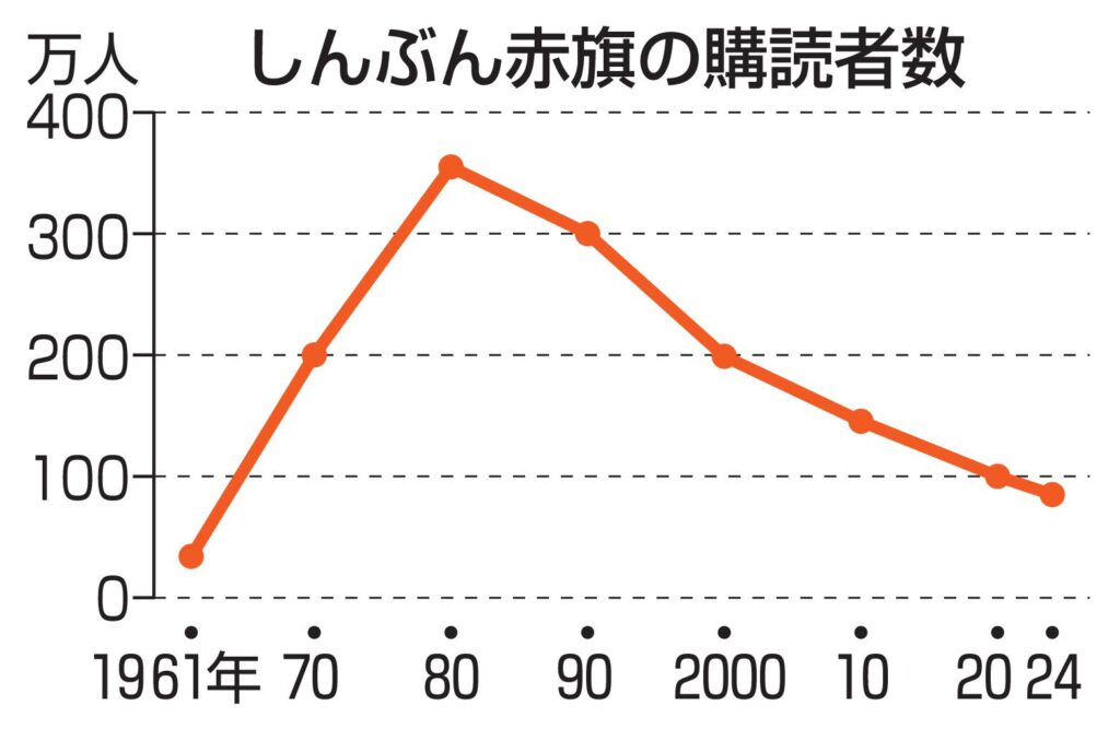 赤旗は日刊紙と日曜版を発行。二つを合わせた購読者は1980年の355万人がピークで、昨年1月時点で85万人まで落ち込んだ。自民党派閥裏金事件などの調査報道で知られる日曜版は黒字を維持するが、日刊紙は年間十数億円の赤字を出している。